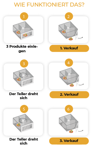 Ganz einfach: Beim Befüllen legen Sie ein Produkt in jedes Fach des rotierenden Tellers. Nach jedem Kauf dreht sich der Teller automatisch – das nächste Produkt wird sofort zum Verkauf angeboten.